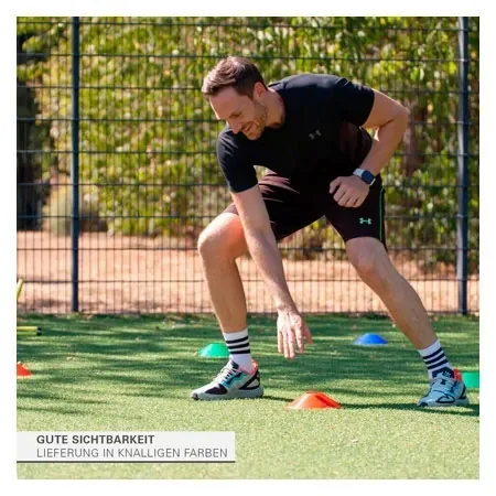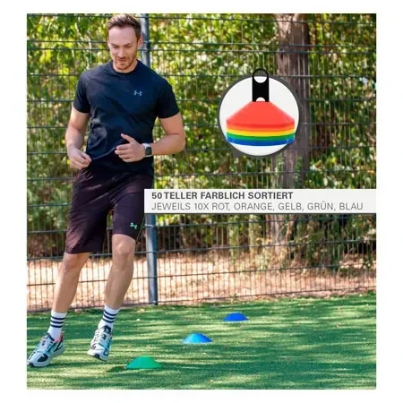 Dieses Markierungssteller-Set besteht aus insgesamt 50 Markierungsteller (10x Rot, 10x Orange, 10x Gelb, 10x Grün und 10x Blau) und einer Halterung. Der Durchmesser eines Markierungstellers entspricht 20 cm. Die Höhe 6 cm. Diese Markierungen kann man für zahlreiche Sport- und Spielarten, verwenden. Ob auf dem Sportplatz oder in der Sporthalle, sie sind ein ideales Hilfsmittel für Schnelligkeit, Koordiantion, Krafttraining und vieles mehr.