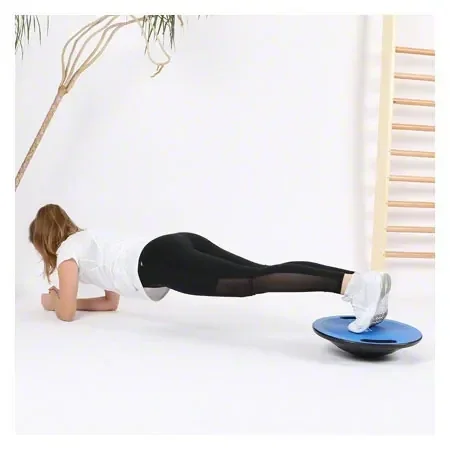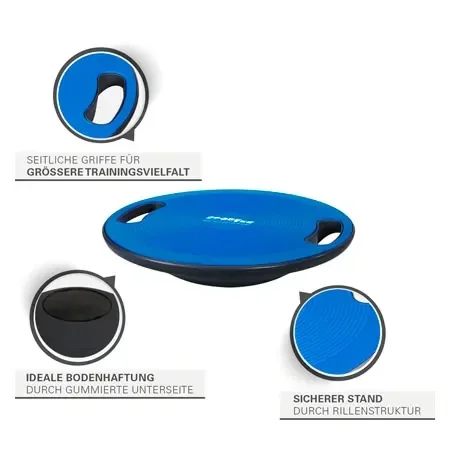 Das Balance Board ist ein sehr gutes Trainingsgerät für Gleichgewicht und Körperspannung. Dieses Board hat 2 Griffe, womit die Handgelenke entlastet werden und mehr Übungen, wie z. B. Liegestütze, möglich sind. Der Bodenbelag ist rutschfest, womit ein sicherer Kontakt zum Boden ermöglich wird. Die Oberfläche ist mit einem Profil versehen, welches einen sicheren Halt bietet. Die max. Belastbarkeit ist 150 kg. Der Durchmesser beträgt 40 cm und die Höhe 10 cm. Das Material ist Kunststoff.